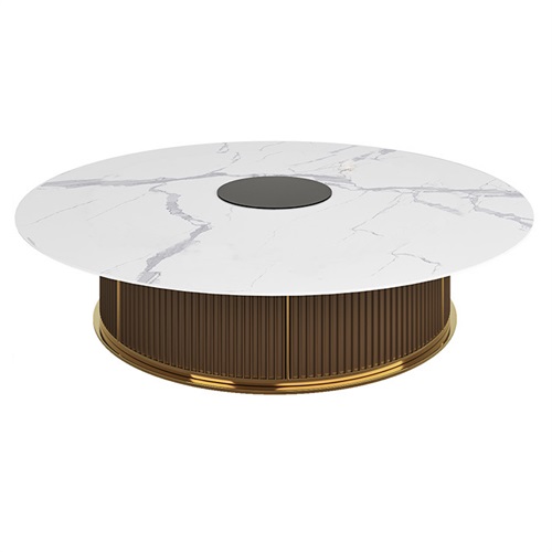 是由天然原料经过特殊工艺,借助万吨以上压机压制(超过15000吨),结合先进的生产技术,经过1200℃以上高温烧制而成,能够经得起切割、钻孔、打磨等加工过程的超大规格新型瓷质材料。餐桌面或者是转盘面采用岩板设计,具有轻、耐磨、无渗透等优点。
